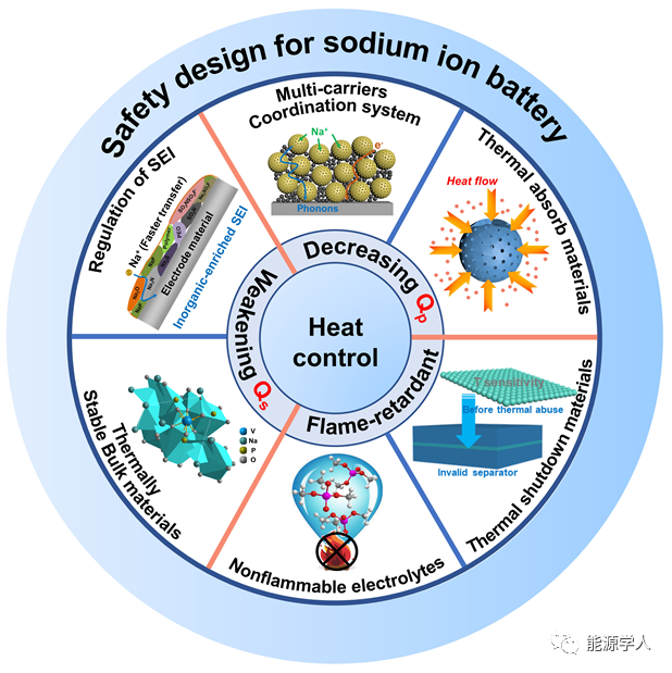 近期,武漢理工大學(xué)麥立強(qiáng)教授(通訊作者)和尤雅教授(通訊作者)從材料層面總結(jié)與分析了電池中主要產(chǎn)熱來(lái)源,熱失控過程引起的化學(xué)反應(yīng)、衡量電池安全性的重要參數(shù),并討論了為降低熱效應(yīng)電極材料的設(shè)計(jì)準(zhǔn)則。第一作者為武漢理工大學(xué)博士研究生楊超。文章主要圍繞減少電池內(nèi)部極化熱(Qp)和副反應(yīng)熱(Qs)、加快熱傳遞速率、阻燃和功能性熱保護(hù)材料做了詳細(xì)探討。該文重點(diǎn)關(guān)注電池的熱行為,并提出一些潛在可行的策略,這將加深對(duì)SIBs熱失控的了解,并加速熱安全體系電池材料的設(shè)計(jì)。該工作發(fā)表于材料領(lǐng)域期刊Advanced Energy Materials,題為“Materials Design for High-Safety Sodium-Ion Battery”。