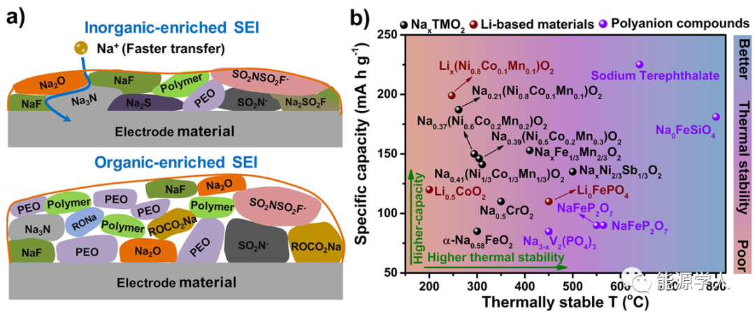 圖4 a)陽(yáng)極表面無(wú)機(jī)物種富集SEI(頂部)和有機(jī)物種富集SEI的示意圖。b)各種SIBs正極材料的比容量和熱穩(wěn)定性的比較(熱穩(wěn)定性數(shù)據(jù)通過DSC測(cè)定脫鈉態(tài)材料獲得)。