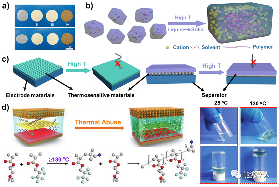 圖6 a) Celgard隔膜(i)、玻璃纖維(ii)、GF/PVDF-HFP(iii)和GF/PVDF-HFP/PDA(iv)在室溫下(頂部)和在200 °C下熱處理30分鐘(底部)后的照片。b)高溫自聚電解質(zhì)作為熱停堆材料的原理圖。c)熱響應(yīng)涂層和隔膜示意圖。d)智能溫度響應(yīng)電解液(PPE)在電池中的熱響應(yīng)行為及其在熱濫用條件下的自由基聚合機(jī)理的示意圖,以及25°C和130°C熱濫用后PPE的光學(xué)照片。