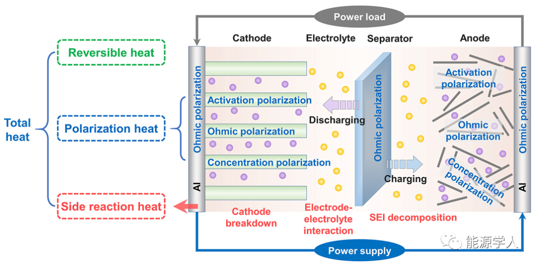 熱來(lái)源:如圖1所示,鈉離子電池運(yùn)行過程中產(chǎn)生的熱量可分為三類:可逆熱Qr、極化熱Qp和副反應(yīng)熱Qs。可逆熱Qr,通常是由于電化學(xué)反應(yīng)過程中的可逆熵變ΔS引起的,極化熱Qp是指充放電過程中由于歐姆極化、活化極化和濃差極化造成額外的能量消耗而產(chǎn)生的熱量。Qs指在電池化學(xué)/電化學(xué)副反應(yīng)引起的不可逆熱,包括負(fù)極表面SEI和正極表面CEI的分解,電解質(zhì)和電極材料之間的反應(yīng)等。根據(jù)電化學(xué)反應(yīng)和材料的本征性質(zhì)不同,Qr既可能是吸熱也可能是放熱過程,而Qp和Qs通常為放熱過程。如果電池中的放熱反應(yīng)失控,就會(huì)發(fā)生熱失控事件,這是SIBs最具災(zāi)難性的失效模式之一。