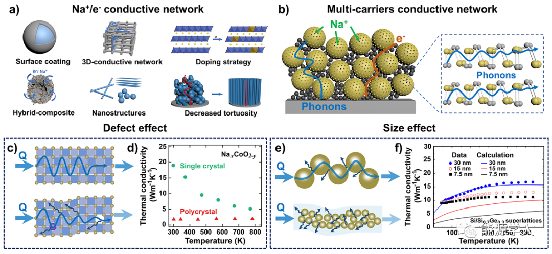 圖3 a)Na+/e-導(dǎo)電網(wǎng)絡(luò)構(gòu)建策略的示意圖。b)多載流子導(dǎo)電網(wǎng)絡(luò)的示意圖,包括Na+、e-和聲子。c)完美晶格(頂部)和扭曲缺陷晶格(底部)中聲子傳輸和散射的示意圖。d)研究了NaxCoO2-y單晶和多晶樣品的熱導(dǎo)隨溫度的變化。e)頂部為大尺寸粒子間聲子傳輸和散射示意圖,底部為小尺寸粒子間聲子傳輸和散射示意圖。f)不同尺寸Si/SiGe超晶格的聲子熱導(dǎo)率。