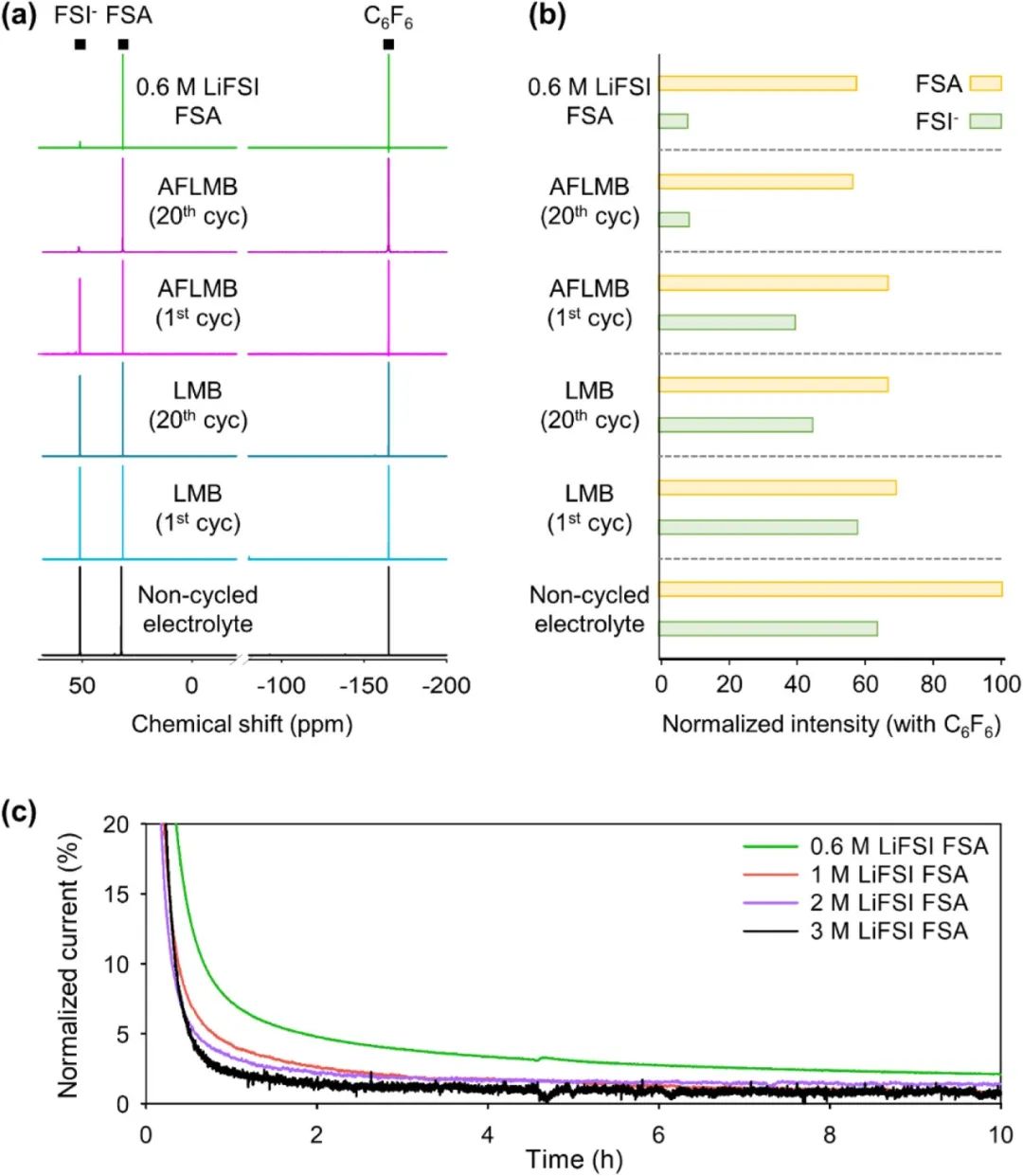 圖3. (a) 0.6 M LiFSI FSA 電解質(zhì)、非循環(huán)電解質(zhì)、AFLMB 和 LMB 與 3 M LiFSI FSA 電解質(zhì)經(jīng)過(guò) 1 個(gè)和 20 個(gè)循環(huán)后的 19F NMR 光譜。(b) 19F NMR 光譜中 FSI 陰離子和 FSA 溶劑峰的綜合面積,使用 (a) 19F NMR 光譜中 C6F6 的內(nèi)部參考進(jìn)行歸一化。(c) Cu/NCM811 電池在 25 °C預(yù)循環(huán)后,在 4.25 V 下進(jìn)行的電化學(xué)浮動(dòng)測(cè)試。