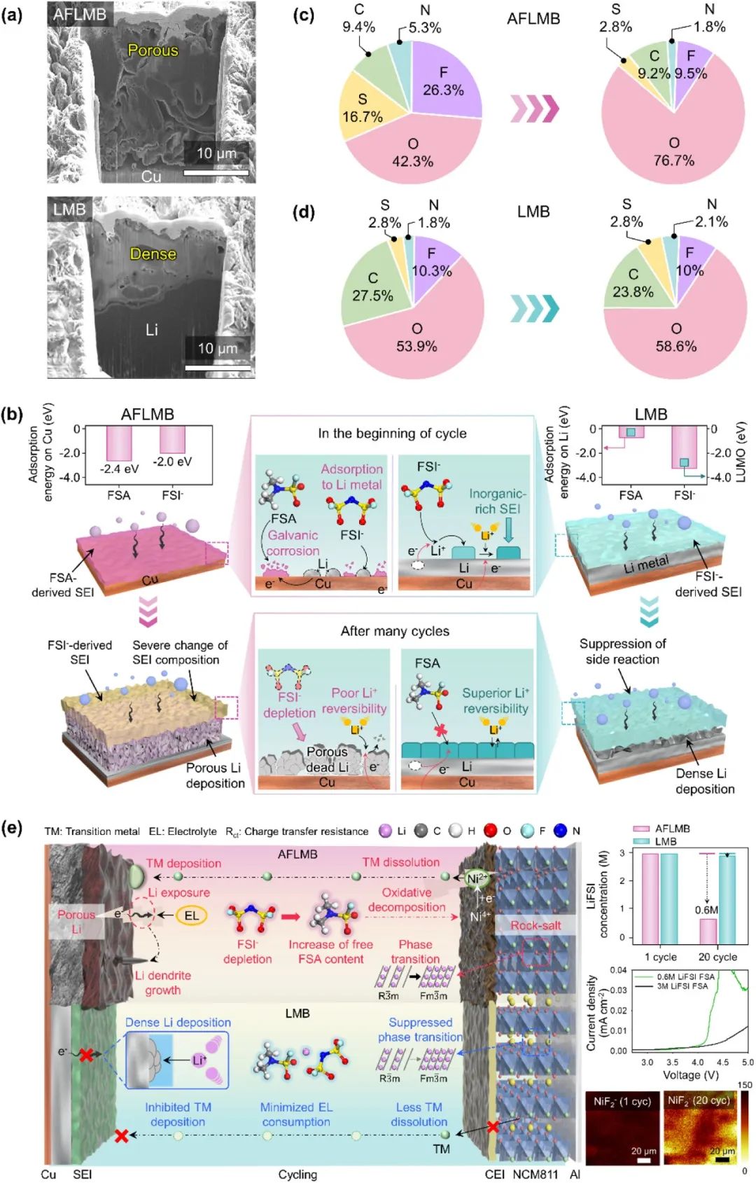 首先探討了AFLMB與鋰金屬電池(LMB)在電化學(xué)性能及其機(jī)制上的差異,特別是銅箔上SEI成分的變化對(duì)鋰金屬沉積的影響。在AFLMB中,鋰金屬以空隙較多的纖維狀形式電沉積,而LMB則顯示出密集的鋰金屬沉積(圖1a)。盡管使用相同的電解質(zhì),AFLMB中FSA溶劑分子在銅箔上具有更強(qiáng)的吸附能力,導(dǎo)致其在充電過(guò)程中消耗電子并發(fā)生不可逆的電化學(xué)還原(圖1b)。這種變化使得初期形成的SEI成分不穩(wěn)定,導(dǎo)致銅箔暴露,進(jìn)而加劇了鋰金屬沉積的不均勻性。AFLMB中由FSA引發(fā)的SEI的腐蝕與電解質(zhì)的持續(xù)分解密切相關(guān),這不僅消耗FSI-形成額外的 SEI 物種,還會(huì)導(dǎo)致形成疏松的鋰(圖 1a 和 b)。LMB中的FSI-能夠優(yōu)先錨定在鋰金屬陽(yáng)極上,形成相對(duì)穩(wěn)定的SEI,進(jìn)而減少了電解質(zhì)成分的寄生反應(yīng)(圖1b-d)。AFLMB中消耗的FSI-增加了游離FSA溶劑分子的數(shù)量,這些分子在陰極的氧化分解上產(chǎn)生了負(fù)面影響(圖 1e)。