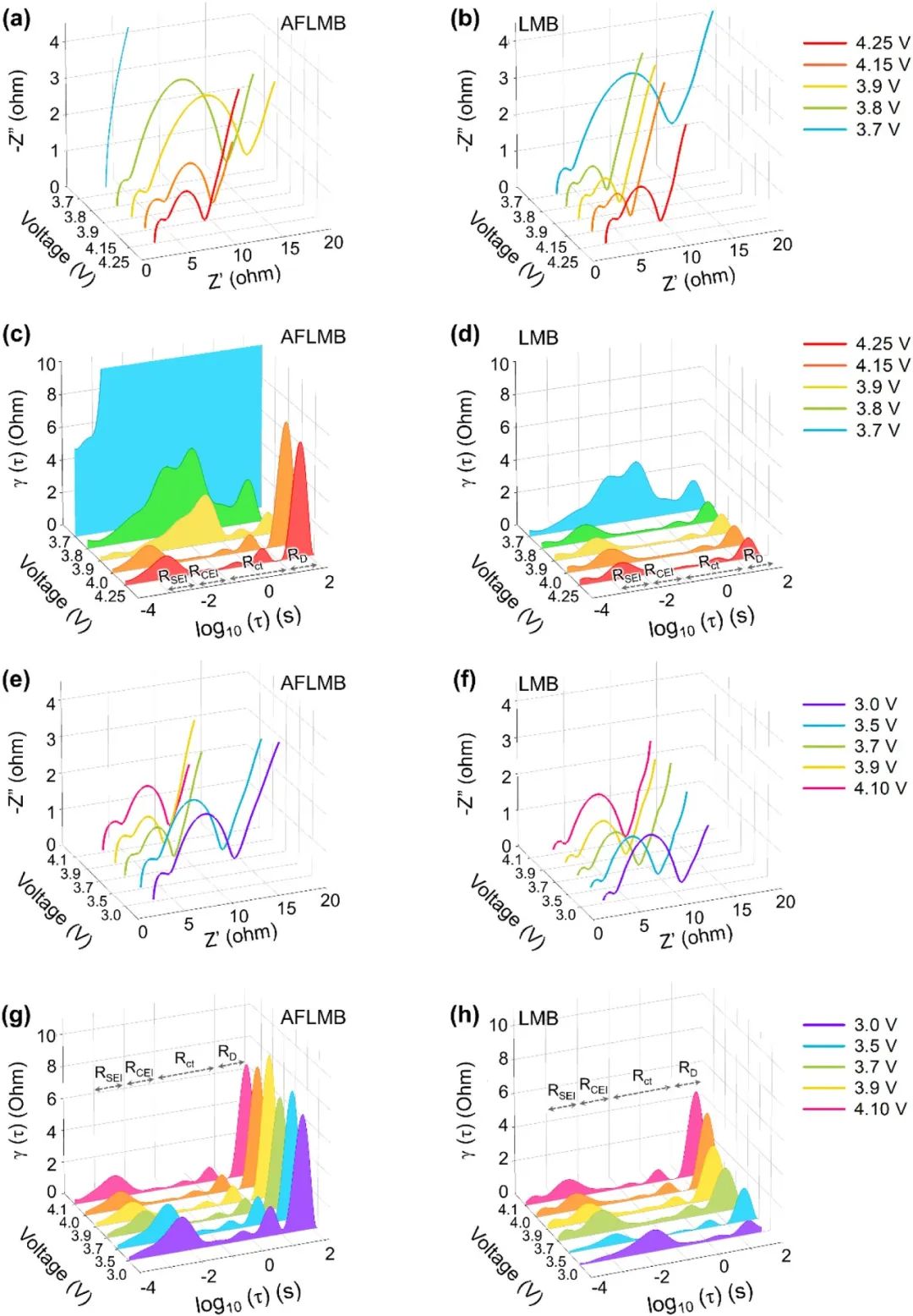 圖6. 不同充電電壓下 (a) AFLMB 和 (b) LMB 的奈奎斯特圖。根據(jù)(c) AFLMB 和 (d) LMB 在預(yù)循環(huán)充電期間的奈奎斯特圖轉(zhuǎn)換的 DRT 曲線。不同放電電壓下 (e) AFLMB 和 (f) LMB 的奈奎斯特圖。根據(jù)預(yù)循環(huán)放電過(guò)程中 (g) AFLMB 和 (h) LMB 的奈奎斯特圖轉(zhuǎn)換的 DRT 曲線。