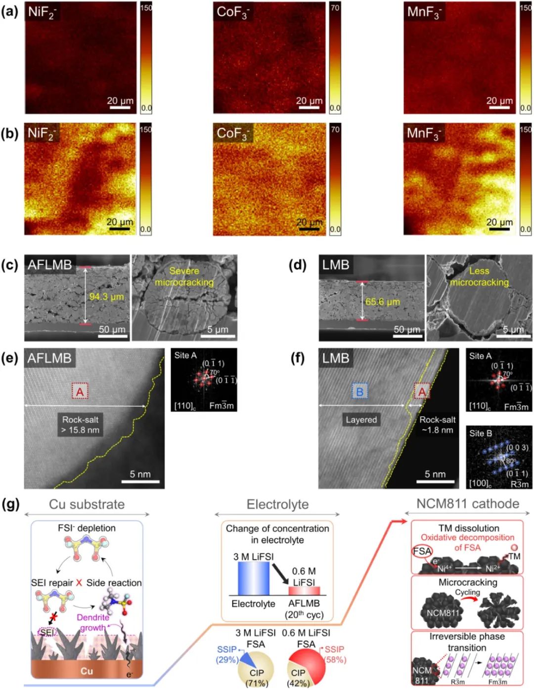 圖7. 在 C/3 和 25 ℃ 下分別經(jīng)過(guò) (a) 20 次和 (b) 100 次循環(huán)后,AFLMB 中銅上的 NiF2-、CoF3- 和 MnF3-的 TOF-SIMS 化學(xué)圖譜。在 C/3 和 25 °C 下循環(huán) 100 次后,從 (c) AFLMB 和 (d) LMB 中提取的 NCM811 陰極的截面 SEM 圖像。在 C/3 和 25 °C 下循環(huán) 100 次后,從含有 3 M LiFSI FSA 電解液的 (e) AFLMB 和 (f) LMB 中提取的 NCM811 陰極的 STEM 圖像和 FFT 圖樣。(g) FSI 陰離子耗竭和 SEI 降解對(duì) NCM811 陰極的交叉影響。