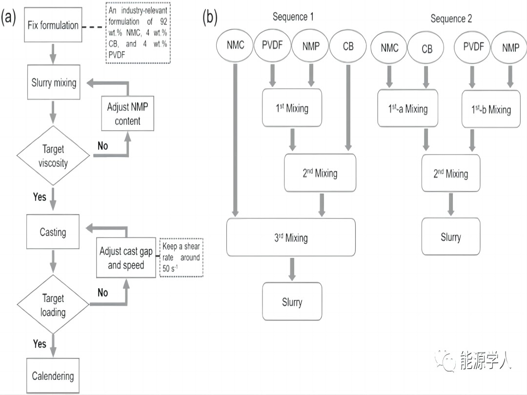 從漿料的制備工藝出發(fā),美國肯塔基州列克星敦大學(xué)和福特汽車公司研究團(tuán)隊研究了兩種主流的工業(yè)混合順序?qū){料流變行為的影響,以及漿料流變與LiNi0.33Mn0.33Co0.33O2(NMC)電極的結(jié)構(gòu),機(jī)械和電化學(xué)性能之間的關(guān)系。研究發(fā)現(xiàn):1)在添加NM